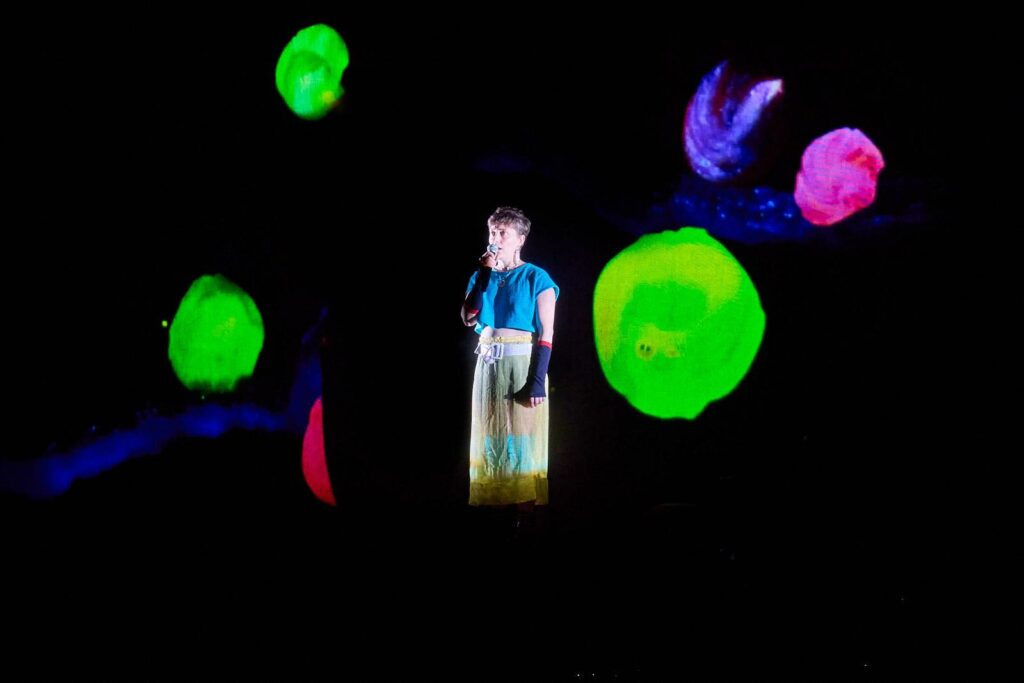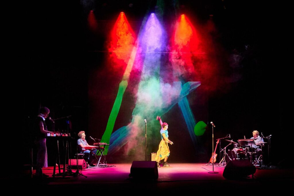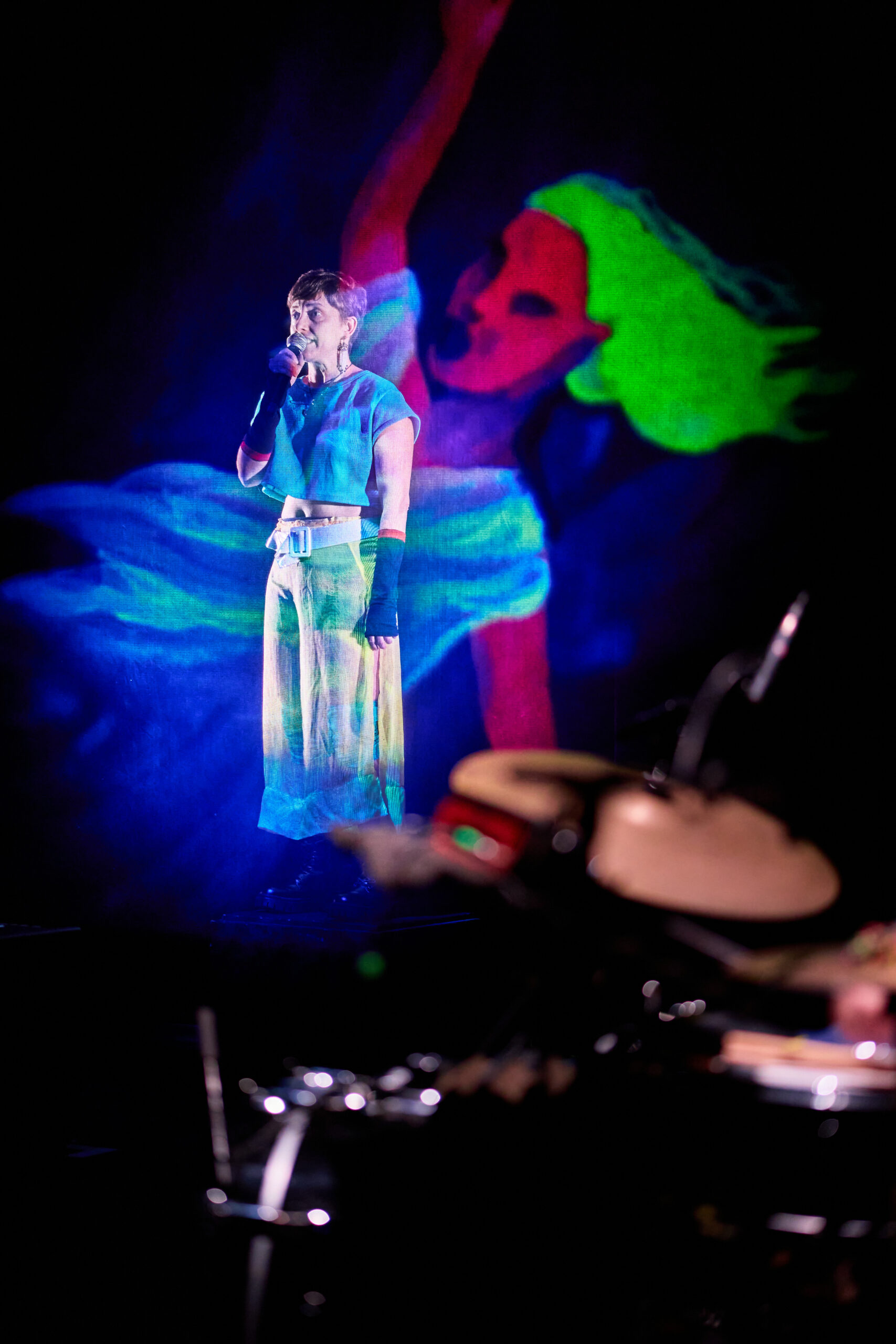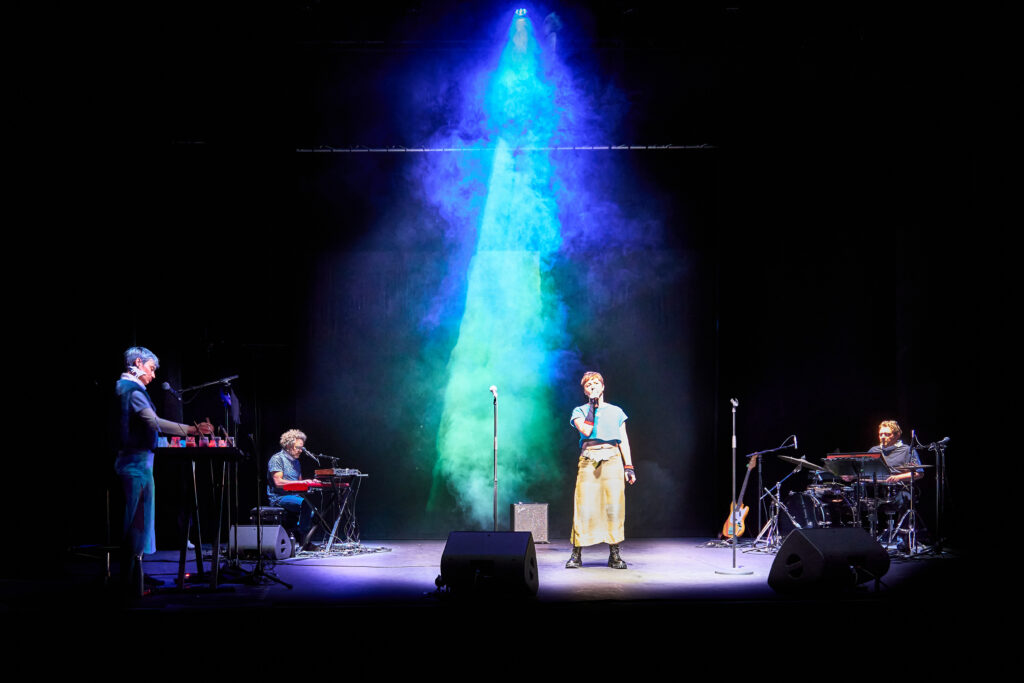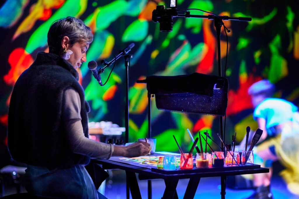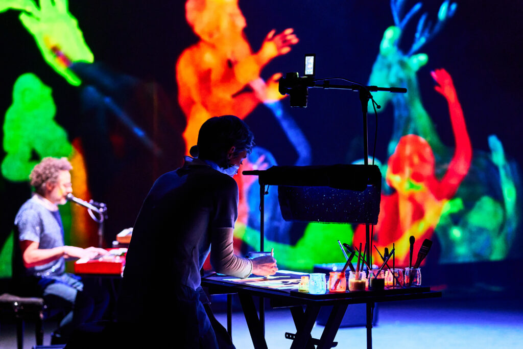 Sur scène, instruments de musique, micros, amplis. Une table où l’on distingue peinture et papier. Au loin, un écran. Le public va-t-il assister à un concert, une performance filmée, du théâtre ?